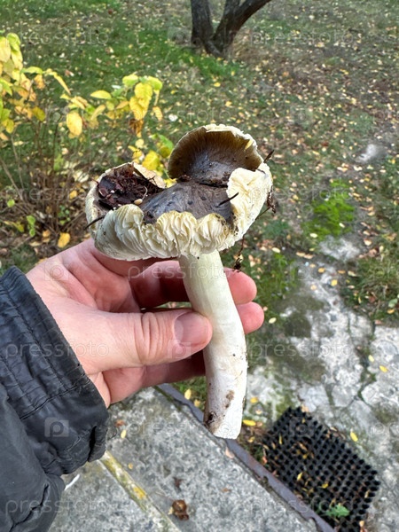 Большая Tricholoma portentosum в руке собирателя грибов.Осенний сбор грибов