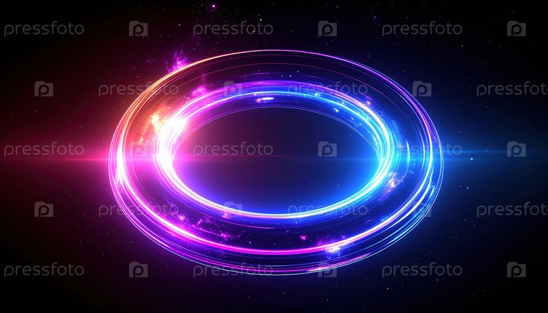 Футуристическое неоновое кольцо света, плавающее в космическом пространстве, символизирует технологический портал цифровых инноваций и бесконечной энергии, представляющий собой современные научные концепции дизайна