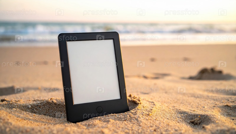 Читатель электронных книг, стоящий на песке у моря на рассвете, представляет современную свободу чтения и цифровые знания о досуге и путешествиях