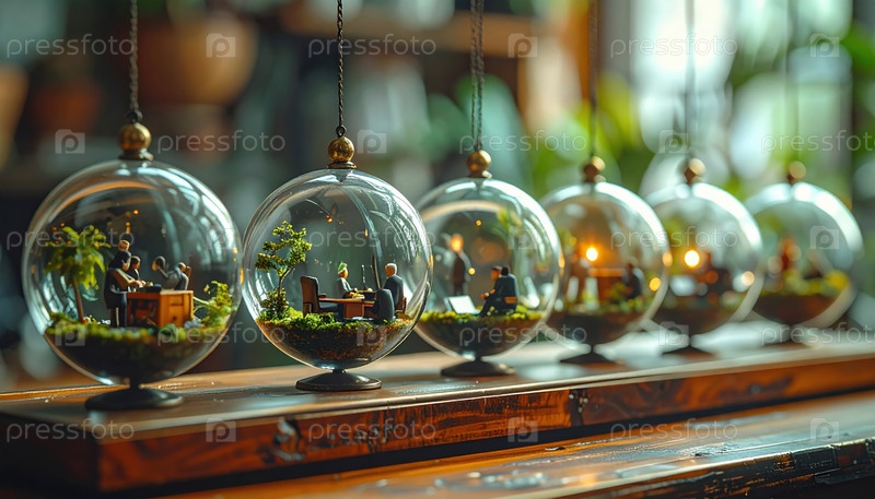 Миниатюрные бизнес-сцены, заключенные в стеклянные сферы, символизирующие изоляцию и взаимосвязанную корпоративную среду