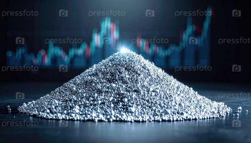 Куча металлических гранул из сырого серебра с финансовым графиком на заднем плане, символизирующим рынок драгоценных металлов, добычу полезных ископаемых и инвестиции в серебряные товары