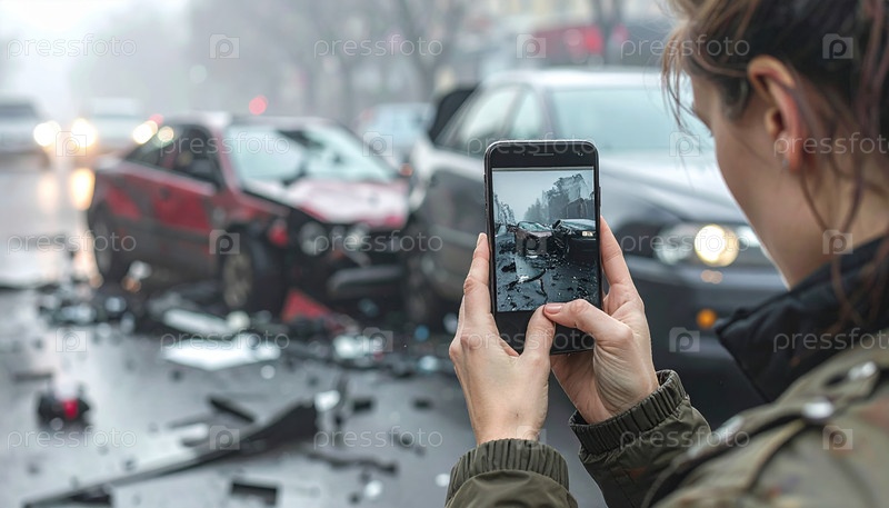 Женщина фотографирует обломки автомобильной аварии на дождливой улице, концепцию страхового возмещения, сообщения в социальных сетях и чрезвычайные ситуации в городской жизни
