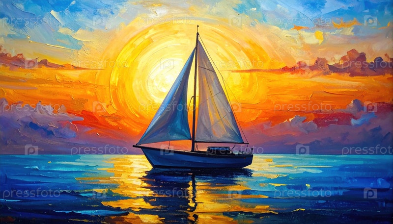 Масляная живопись парусника на море во время красочного заката, символизирующая свободу, путешествия, мир, художественное выражение и вдохновение от природы и жизни океана