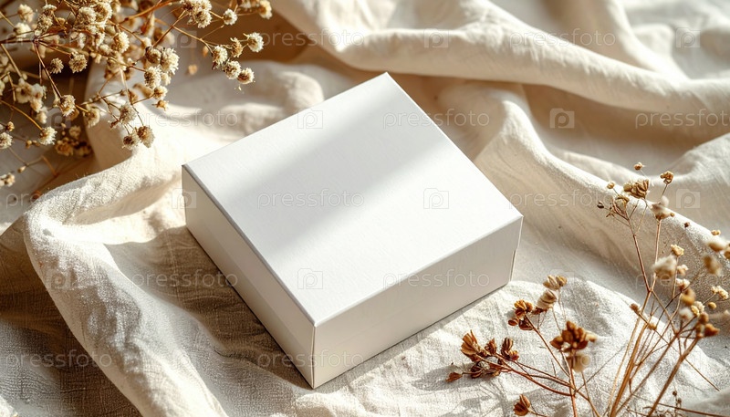 Минимальная белая мягкая ткань подарочная коробка с сушеными цветами, представляющая простоту, экологически чистую упаковку, устойчивый дизайн и естественную эстетику для образа жизни или брендинга продукта