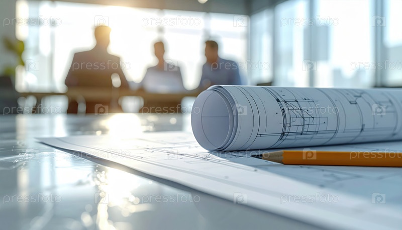 Архитектурный проект с карандашом в офисе, символизирующий инновационное сотрудничество и планирование в области инженерии или строительства