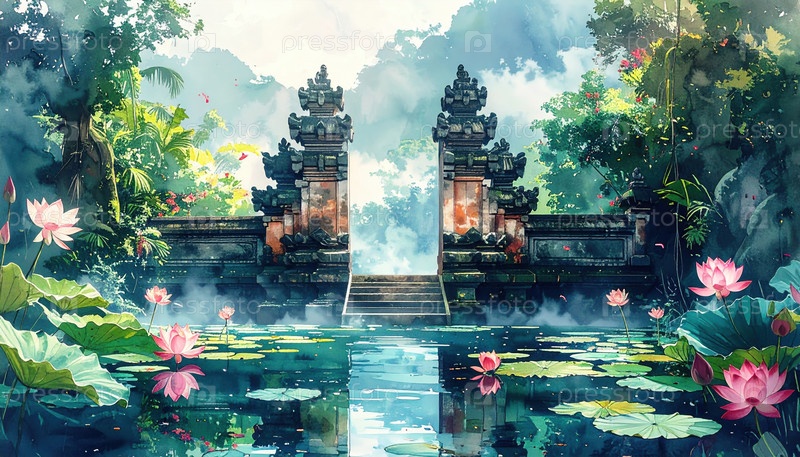 Древние храмовые ворота, окруженные лотосными прудами и туманным лесом, символизируют духовность, медитацию и гармонию между человеческим творчеством и естественным спокойствием