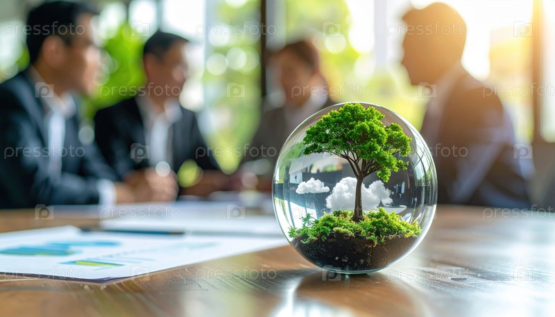 Стеклянный шар с миниатюрным зеленым деревом, символизирующим устойчивость и заботу об окружающей среде во время корпоративного совещания по экологической бизнес-стратегии