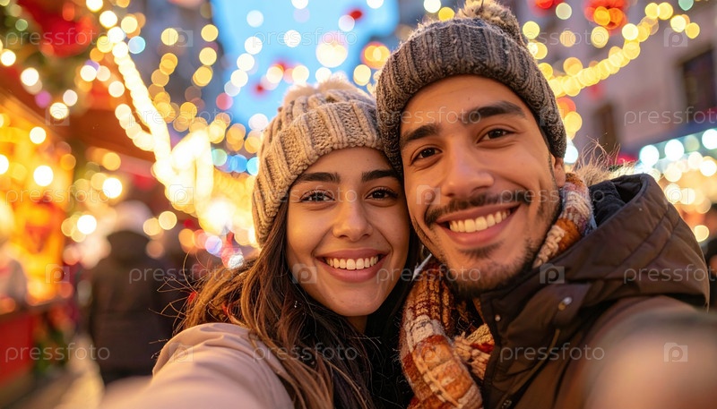 Пара наслаждается праздничными огнями на рождественском рынке, захватывая радостный дух праздника в уютной зимней атмосфере с яркими украшениями и теплыми эмоциями