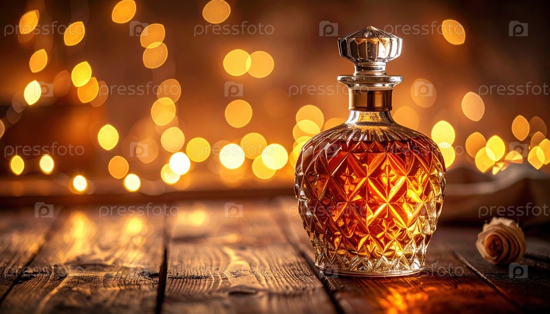 Хрустальный декантер, заполненный янтарным ликером на деревянном столе под праздничными огнями передает роскошь, мастерство и теплое праздничное настроение