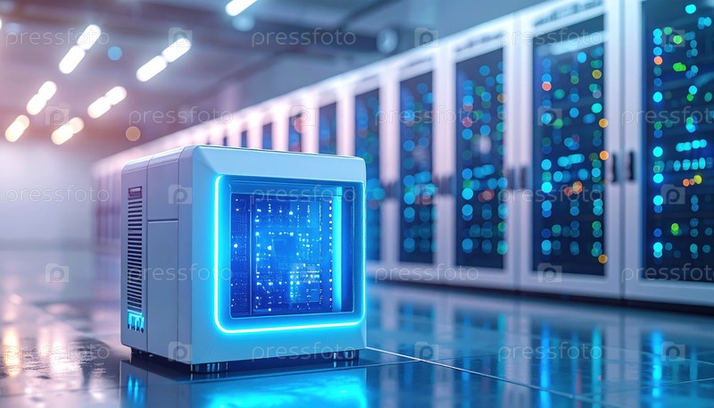 Футуристическая серверная комната с освещенными компьютерными блоками и синим светом символизирует искусственный интеллект, обработку данных и будущее технологий облачных вычислений