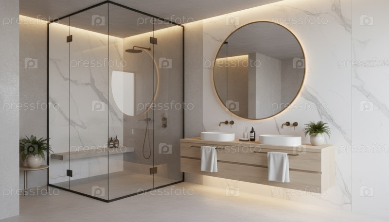 Минималистский интерьер ванной комнаты с мраморным стеклянным душем и теплым освещением, отражающим элегантность спокойствия и современный роскошный образ жизни