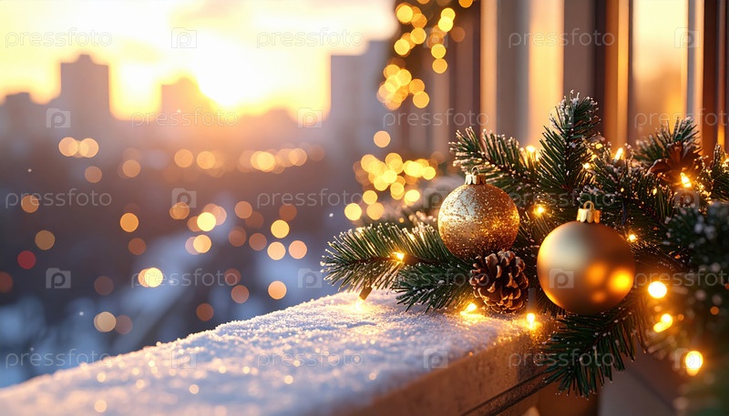 Золотые рождественские украшения и сосновые ветви на снежном балконе при закате солнца вызывают тепло, размышления и праздничный дух зимой