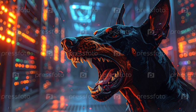 Агрессивный черный доберман охраняет центр обработки данных, освещенный неоновыми огнями, которые представляют угрозу кибербезопасности и концепции цифровой защиты в современную эпоху