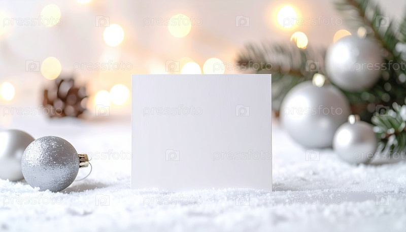Белая открытка в снежной рождественской обстановке с серебряными орнаментами и сосновыми ветвями, готовая для персонализированного праздничного поздравительного сообщения или дизайна торгового брендинга