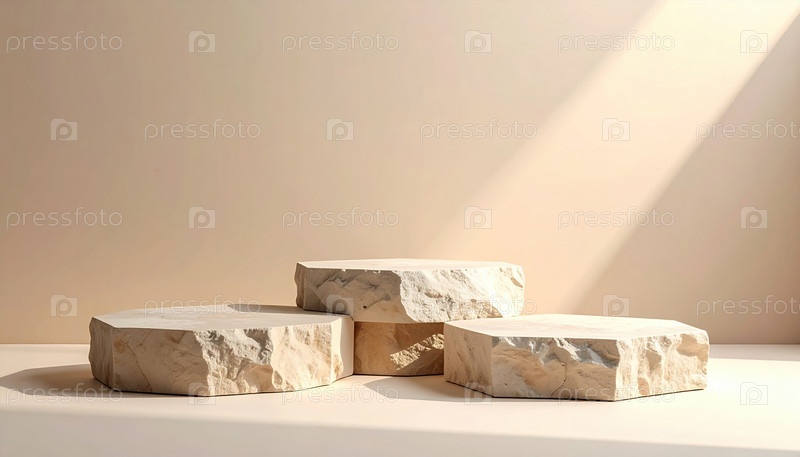 Подиумы из натурального камня под теплым светом, символизирующие стабильность фундамента и минималистический дизайн для презентации продукта