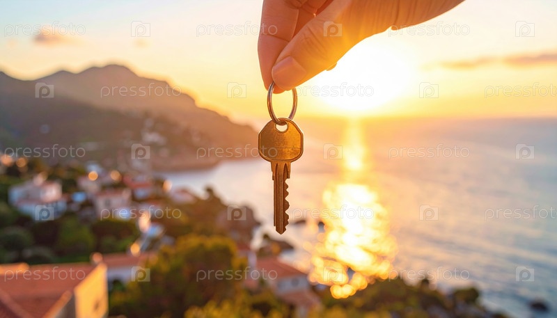 Рука, держащая ключ от прибрежного города на закате солнца, символизирует свободу, инвестиции в недвижимость или достижение жизненных целей через новые возможности