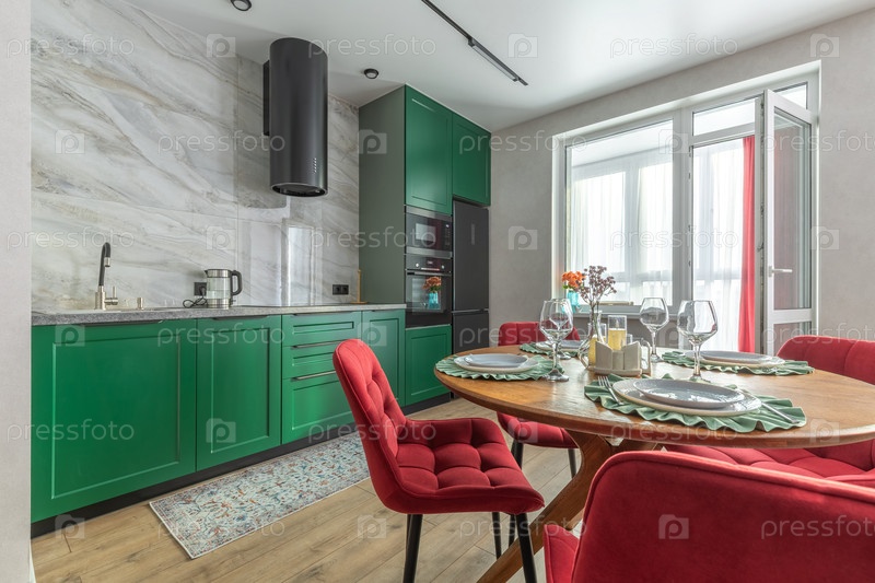 Стильная современная кухня с зелеными шкафами, мраморной стеной, деревянным полом и красными бархатными стульями создает уютную обеденную зону