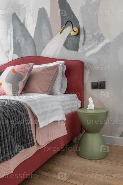 Стильные современные спальни с розовой мягкой кроватью, абстрактными обоями, деревянным полом и элегантным ночным столом