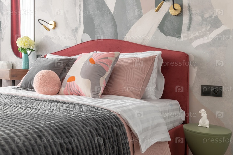 Уютная современная спальня с розовой мягкой кроватью, серое одеяло, декоративные подушки и художественный обои, создавая стильный вид