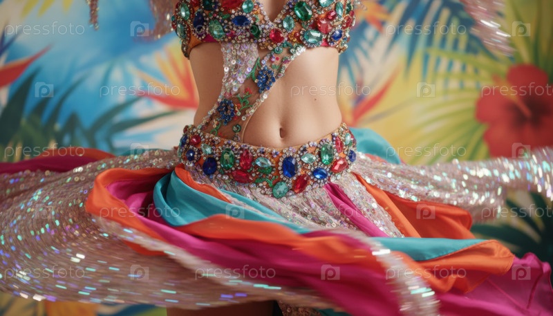 Танцовщица, вращающаяся в красочном костюме, наполненном драгоценными камнями во время карнавала, показывая ритм, энергию и празднование художественной культуры идеально подходит для концепции мероприятия или фестиваля