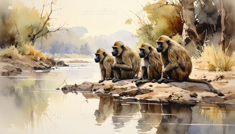 Группа обезьян сидит на берегу спокойной реки в лесу, иллюстрируя любопытство природы, сообщество и социальные связи в гармонии