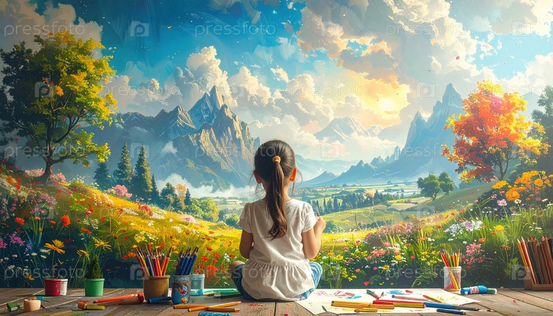 Ребенок, сидящий среди предметов искусства, сталкивается с фантастическим пейзажем красочных гор и цветов, символизирующих воображение, мечты и творчество