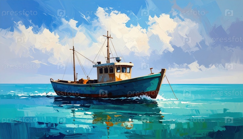 Цифровое изображение рыбацкой лодки, плавающей в тихом бирюзовом море под голубым небом, отражающее мирную прибрежную жизнь и морские традиции в солнечный день