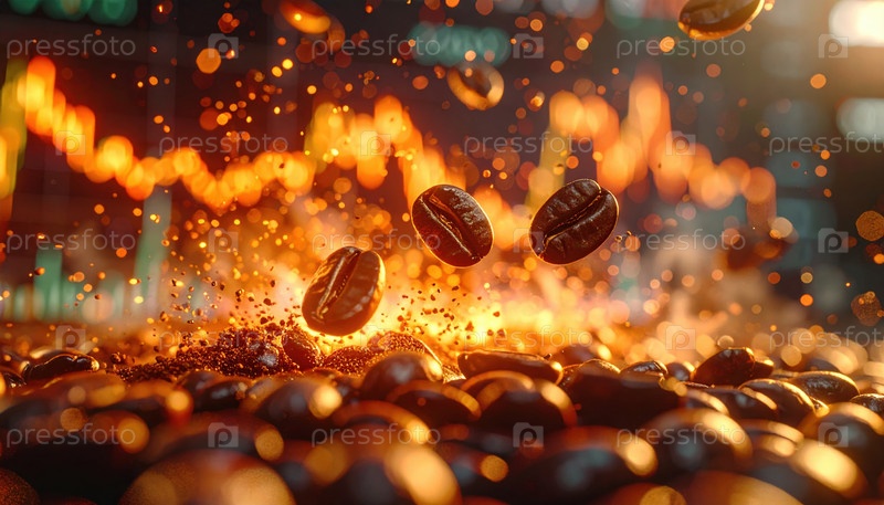 Динамичные кофейные зерна, горящие огненными искрами, символизирующие энергию, творчество, глобальную торговлю, утренние ритуалы и мощную роль кофе в экономике и образе жизни