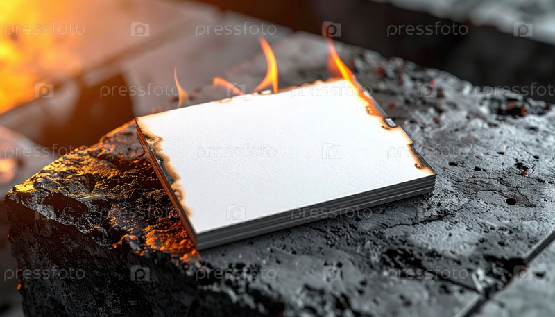 Сжигание белого листа бумаги на черном камне символизирует разрушение идей или обновление через огонь в драматической художественной концепции преобразования и возрождения