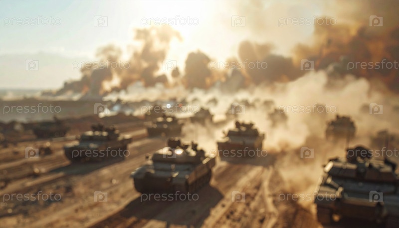 Армейские танки передвигаются по задымленному поле битвы на закате, представляя военные конфликты, власть, глобальные напряженности и тенденции в оборонной отрасли во всем мире