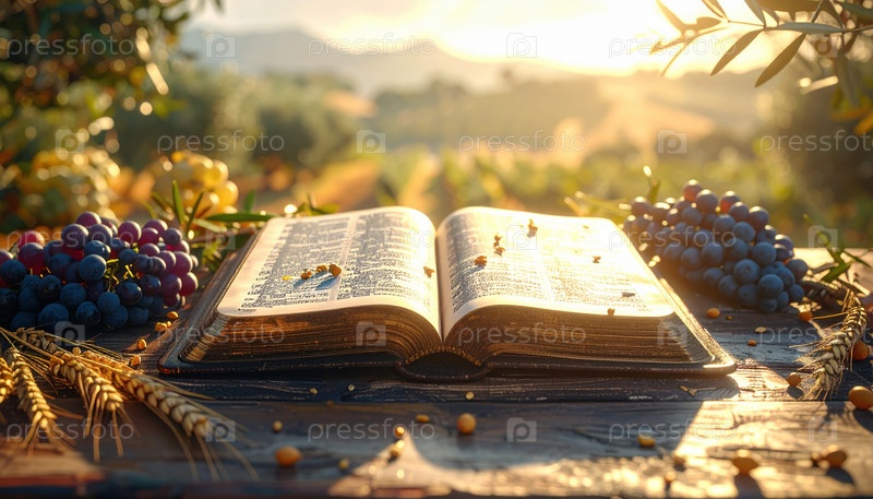 Открытая Библия среди винограда и пшеницы на рассвете символизирует урожай, веру и благодарность, захватывая духовную связь между природой, верой и божественным изобилием