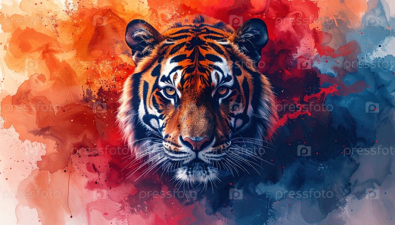 Лицо тигра окружено ярко-красными и синими акварелями, символизирующими силу и энергию