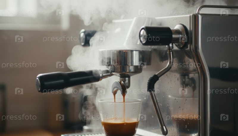 Завершение работы эспрессо-машины для заваривания горячего кофе с повышающимся парами, захватывающей чувственное удовольствие, аромат и мастерство современной культуры кафе