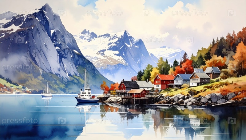 Норвежская фьордовая деревня, окруженная горами и осенними деревьями, отражающимися в тихих водах, символизирующие природу, спокойствие и северную красоту