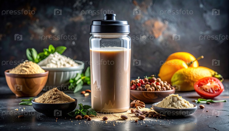 Бутылка протеинового коктейля в окружении натуральных ингредиентов, таких как орехи и фрукты, иллюстрирующая здоровье, питание и современный фитнес-образ жизни