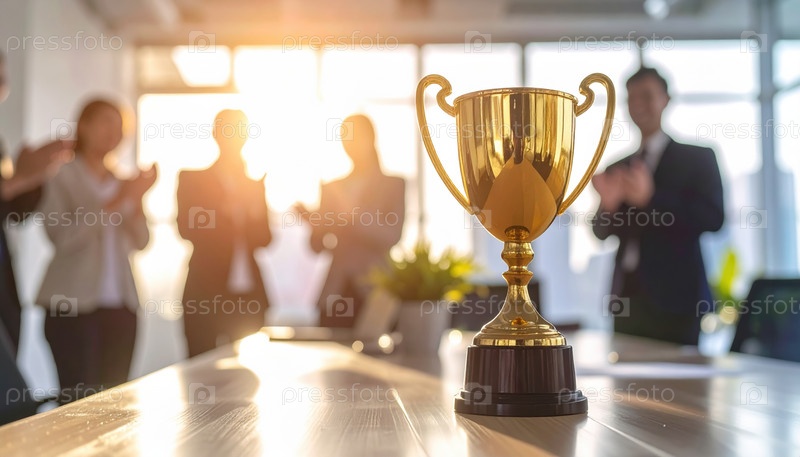 Золотой трофей на офисном столе, представляющий собой концепцию признания успеха в достижении успеха и лидерства