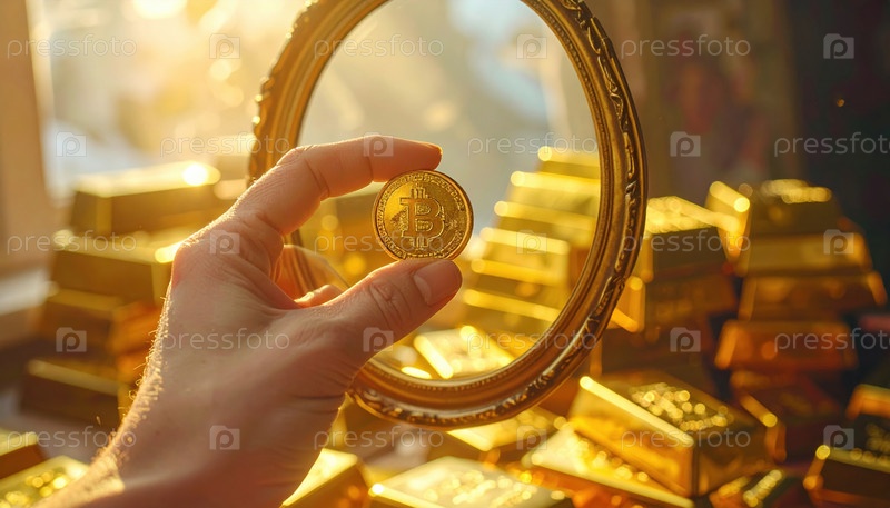Биткойн-золото, хранящееся перед зеркалом с золотыми слитками, символизирует отражение цифрового богатства и передачу стоимости между криптовалютой и традиционными активами