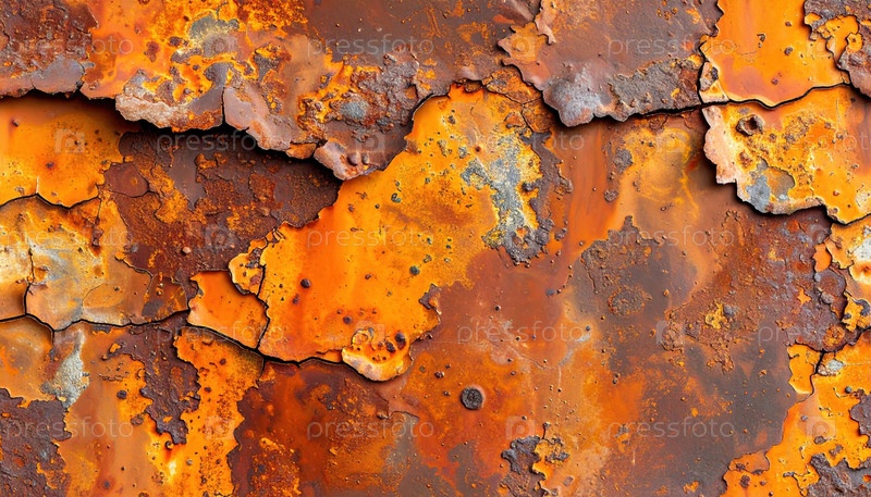 Близкий план ржавой металлической поверхности со слоями оранжевого и коричневого окисления, иллюстрируя распад, течение времени и красоту промышленной коррозии и несовершенства