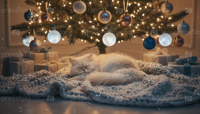 Роскошный белый кот спит под украшенной рождественской елкой в окружении подарков и светящихся огней, символизирующих теплоту, уютность и праздничный домашний комфорт