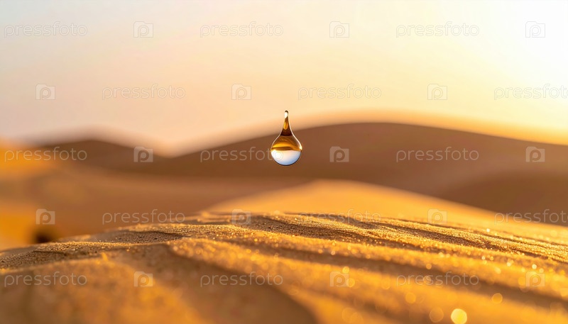 Одна капля воды, парящая над песком пустыни под теплым солнечным светом, представляет собой концепцию дефицита, надежды и устойчивости в контексте изменения климата