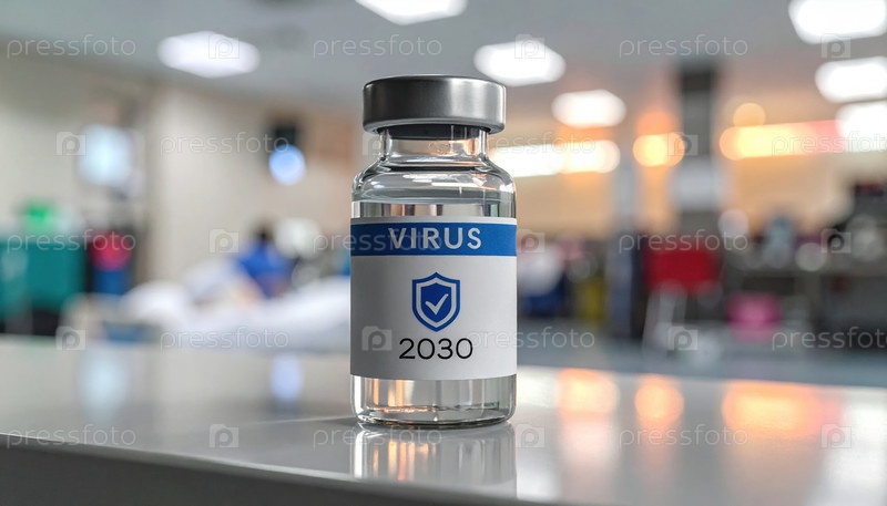 Флакон с вакциной, обозначенный 2030 годом в клинической среде, представляющий будущие медицинские инновации в области биотехнологий, профилактики и защиты от вирусов