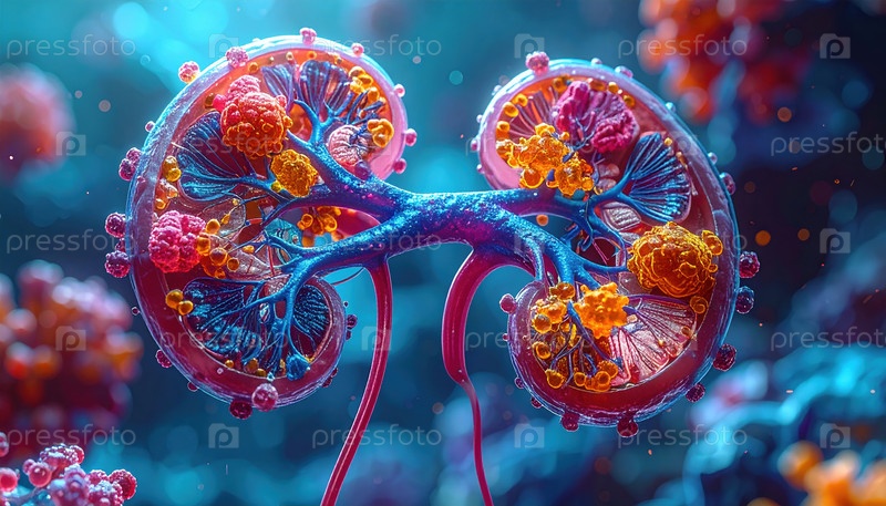 Цифровая иллюстрация человеческих почек с артериями и абстрактными клетками, символизирующими медицинскую науку, анатомию, инновации в здравоохранении и биотехнологические исследования
