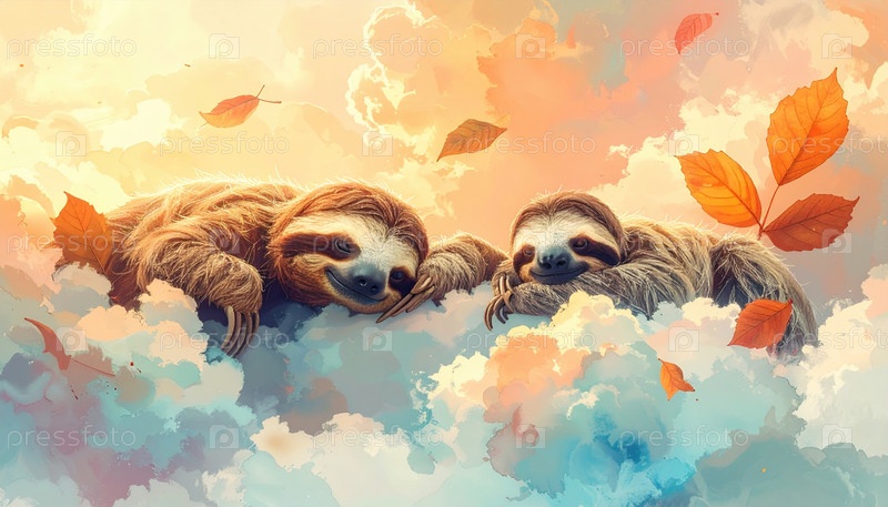 Два ленивца, отдыхающие на мягких облаках под осенним небом, передают мир, расслабление и сказочное спокойствие, идеально подходящее для психического здоровья, осознанности или досуга