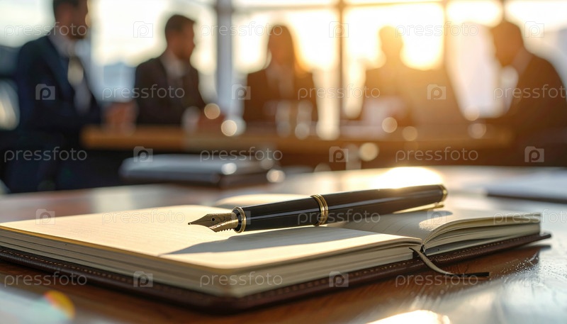 Ручка, опирающаяся на ноутбук с размытой деловой встречей под солнечным светом, символизирует лидерство и принятие решений