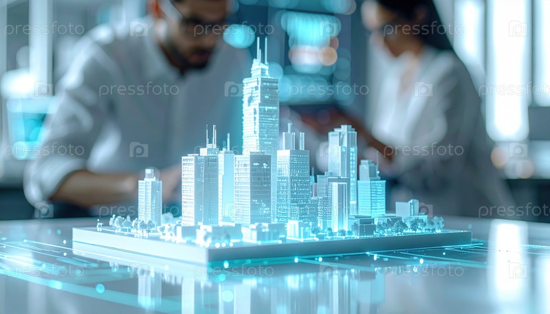 Футуристическая трехмерная голограмма модели города на столе, символизирующая городские инновации, интеллектуальную инфраструктуру и эволюцию цифровой архитектуры и технологий планирования