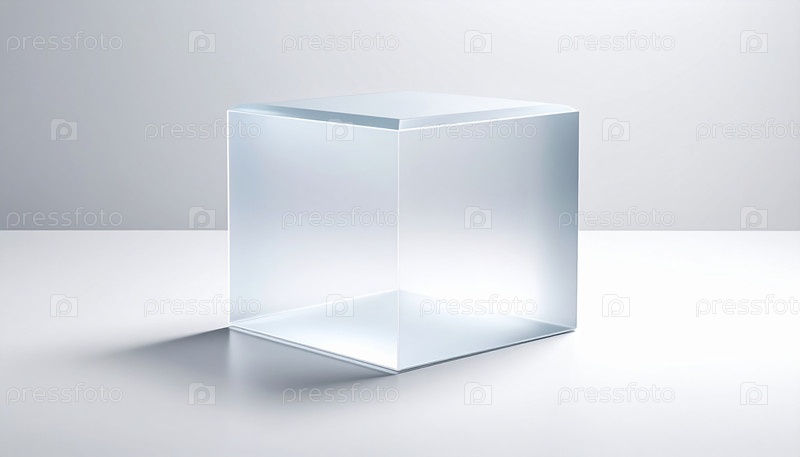Прозрачный стеклянный куб, отражающий свет на белой поверхности, символизирует точные инновации и минимализм в архитектурном дизайне и футуристических технологических концепциях