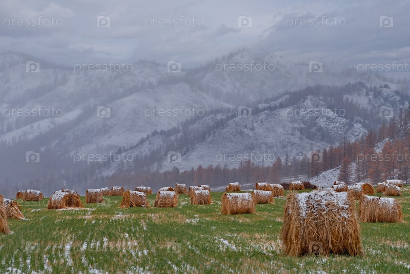 Юг Западной Сибири, Алтайские горы. живописный вид на склонистое поле с рулонами сена, собранными для зимы на фоне заснеженных гор и осенних личин