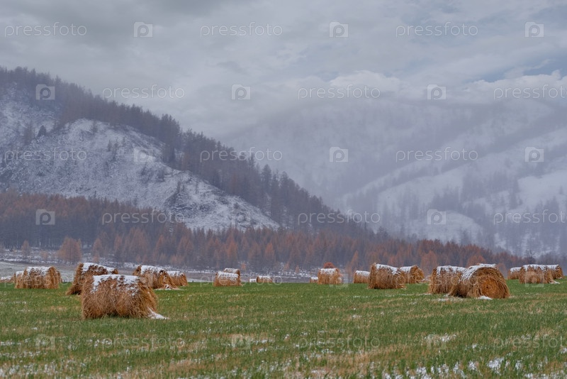 Юг Западной Сибири, Алтайские горы. живописный вид на склонистое поле с рулонами сена, собранными для зимы на фоне заснеженных гор и осенних личин