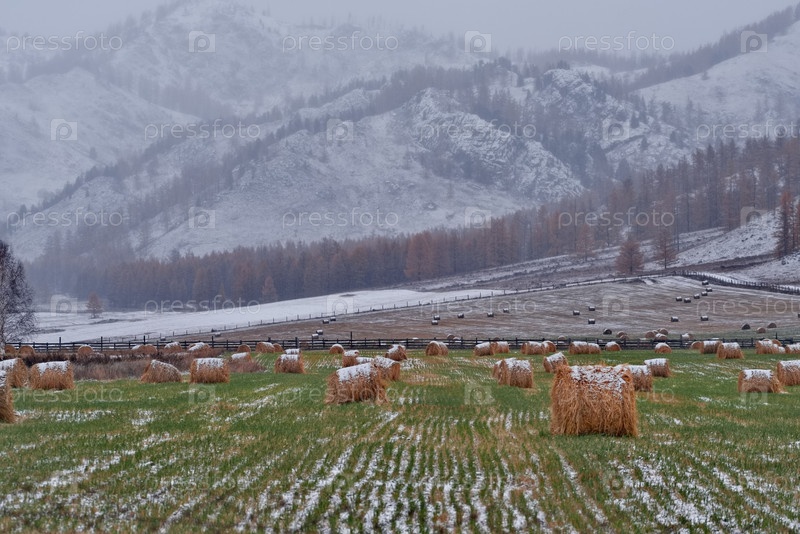 Юг Западной Сибири, Алтайские горы. живописный вид на склонистое поле с рулонами сена, подготовленными к зиме на фоне заснеженных гор и осенних ларьков