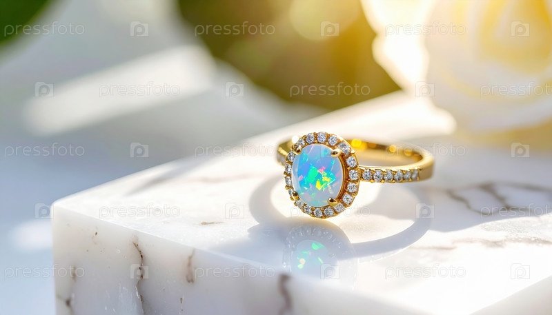 Элегантное опальное обручальное кольцо с золотой ленточкой, отражающей романтику и обещания, освещенное мягким солнечным светом, символизирующее вечную любовь и празднование обязательств